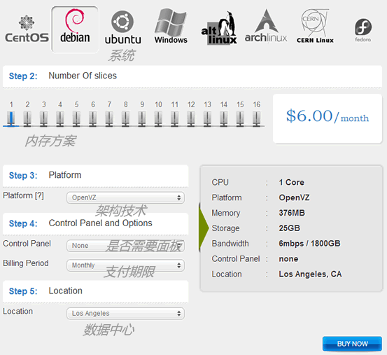 我這里選擇DEBIAN,因?yàn)槲业葧?huì)需要安裝LLSMP安裝包,我還是比較喜歡這個(gè)包的。然后我選擇376M內(nèi)存方案,我只需要放幾個(gè)小博客使用,因?yàn)槲倚枰x擇洛杉磯數(shù)據(jù)中心,所以只有OVZ架構(gòu)技術(shù)的有。我采用月付方案,因?yàn)樵赂妒自孪旅媸褂脙?yōu)惠碼只需要0.01美元,如果用的好以后續(xù)費(fèi)只需要6美元/月,年付節(jié)省10%。