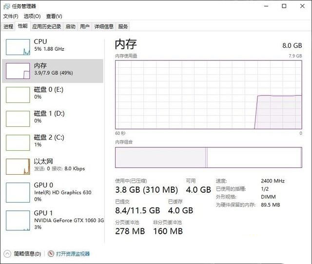 內存是PC中的重要一環(huán),是數(shù)據(jù)存放和交換的空間,所以內存容量相對硬盤小很多。內存斷電后存儲的內容會丟失,所以不能存儲文件。大家看到的C盤、D盤是硬盤,硬盤容量大,斷電后仍能存儲內容,但讀寫速度沒法和內存比。想要看內存使用率、容量、單雙通道的話,可以通過Windows 10的任務管理器查看。
