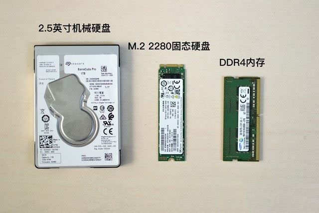 下圖從左到右分別為2.5英寸機械硬盤、M.2 2280固態(tài)硬盤和筆記本內存,三者區(qū)別一目了然。