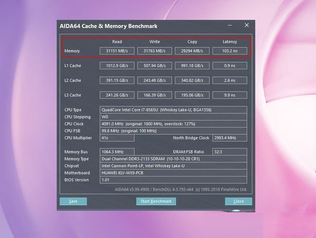 一般情況下,單通道DDR4的讀取、寫入和復制的成績在16000 MB/s-18000 MB/s之間,雙通道DDR4三項成績在30000 MB/s-35000 MB/s之間;雙通道LPDDR3三項成績在28000 MB/s-33000 MB/s之間,單通道LPDDR3很少見,一般不建議購買采用該內存的筆記本。如果數(shù)據(jù)低于以上三個區(qū)間,說明內存性能較差。
