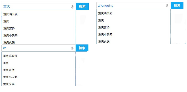 比如輸入“chongqing”或者“zhongqing”都能提示出“重慶火鍋”、“重慶烤魚”、“重慶小天鵝”。