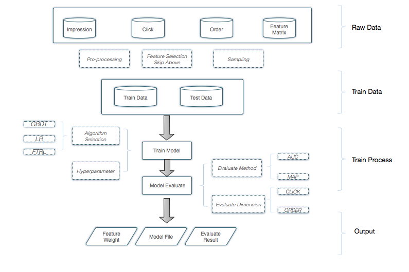 底層是多種模型的實現(xiàn),算法之前相互獨立,每種算法封裝成獨立的jar,提供給模型訓練框架使用,目前支持的算法包括GBDT[4]、FTRL[5]。