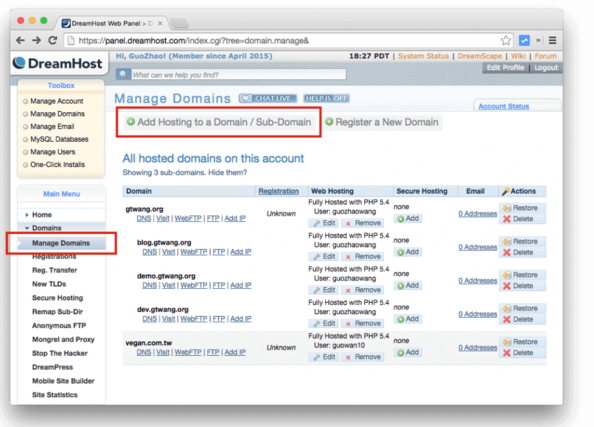 在 DreamHost 的管理界面中,選擇「Manage Domains」頁面,點選上方的「Add Hosting to a Domain / Sub-Domain」。