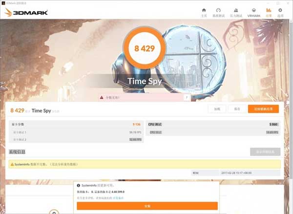 3466MHz下顯卡3DMARK性能測試得分8429
