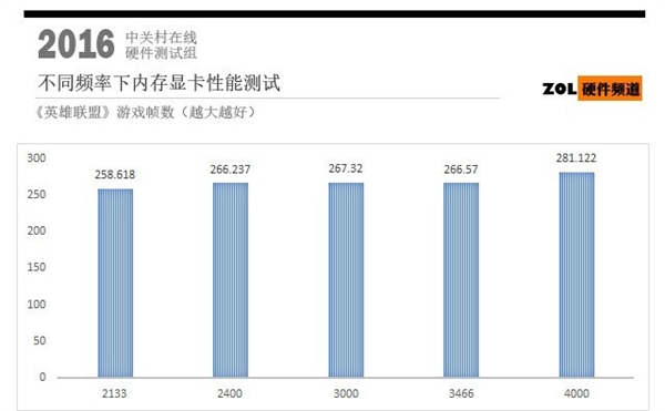 在《英雄聯(lián)盟》測試中,游戲幀數(shù)最高的頻率為4000 MHz,幀數(shù)為281.122,低的則是2133MHz,幀數(shù)為258.618,不過需要注意的出現(xiàn)了3466MHz比3000MHz幀數(shù)高的情況,但從整體情況來說,內(nèi)存頻率和游戲幀數(shù)呈正相關性。