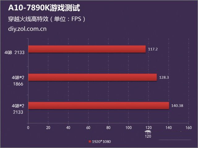 A10-7890K在4GB2133下平均117.2幀,在4GB*21866下平均128.3幀,在4GB*22133下平均140.38幀。