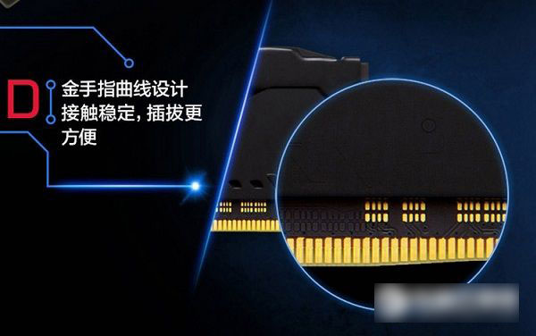 由于接口的改變,DDR4內(nèi)存的金手指觸點達到了284個,每一個觸點的間距從DDR3內(nèi)存的1mm縮減到0.85mm(上一代DDR3內(nèi)存金手指觸點則是240個),這就導致DDR4將內(nèi)存下部設計為中間稍突出、邊緣收矮的形狀,在中央的高點和兩端的低點以平滑曲線過渡,這種就形成了彎曲效果,并且金手指中間的“缺口”也就是防呆口的位置相比DDR3更為靠近中央。