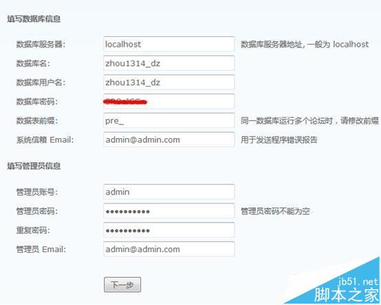14、填寫(xiě)正確的數(shù)據(jù)庫(kù)信息,創(chuàng)建管理員賬號(hào)密碼。