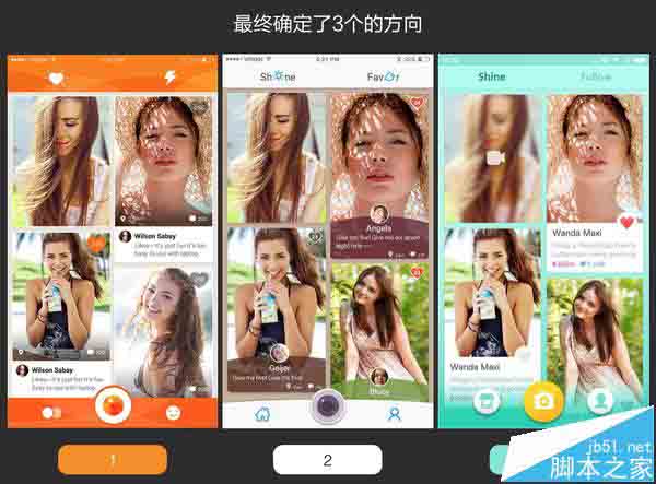 最后如上圖,根據(jù)評審我們選出了票數(shù)最高的三個不同風格的方案,理論上我們認為這三個方案都是正確的、內(nèi)部達成一致、且都符合我們在『情感關(guān)鍵詞』和『情緒板』分析時『陽光溫暖年輕』的設(shè)計目標。但是三個是不同風格各有千秋,而且我們都挺喜歡的,要怎么抉擇呢?最后就要試探一下用戶的感覺了。