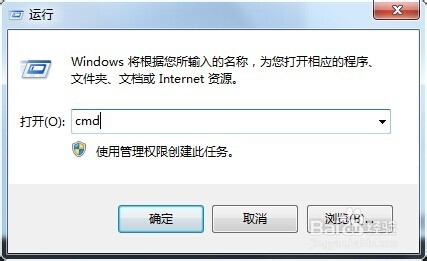 2、在彈出來的窗口輸入“CMD”,然后確定或者按下回車鍵。