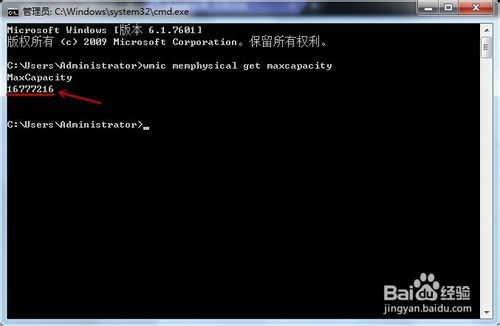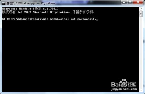 3、在命令窗口輸入“wmic memphysical get maxcapacity”然后敲下回車鍵。