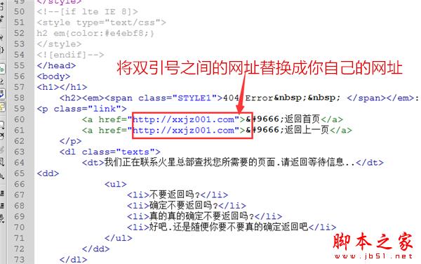 2、用Dreamweaver軟件,打開404.php這個文件,如下圖所示,將雙引號之間的“http://xxjz001.com”修改成你自己的網(wǎng)址,修改完成后,點擊“文件”-“保存”。