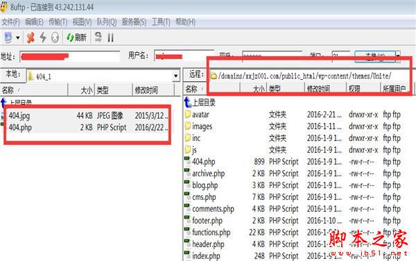 3、打開FTP上傳工具,將404文件夾和404.php上傳到網(wǎng)站的根目錄的主題文件夾,如果提示覆蓋的話直接覆蓋。(若你不知道你的網(wǎng)站根目錄是哪個文件夾,可以咨詢你的空間服務(wù)商)。