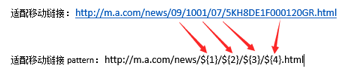 1)規(guī)則適配:當(dāng)pc地址和移動(dòng)地址存在規(guī)則(pattern)的匹配關(guān)系時(shí)(如PC頁面www.jb51.net/picture/12345.html,移動(dòng)頁面m.jb51.net/picture/12345.html),可以使用規(guī)則適配,添加pc和移動(dòng)的正則表達(dá)式。強(qiáng)烈建議您使用規(guī)則適配,一次提交成功生效后,對于新增同規(guī)則的URL可持續(xù)生效,不必再進(jìn)行多次提交。同時(shí)該方式處理周期相對URL適配更短,且易于維護(hù)和問題排查,是百度推薦使用的提交方式。