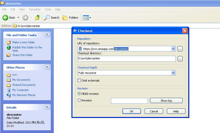 在彈出頁面中填寫倉庫路徑即可,這里是:https://svn.sinacloud.com/devcenter/,其它默認參數(shù)即可,如圖: