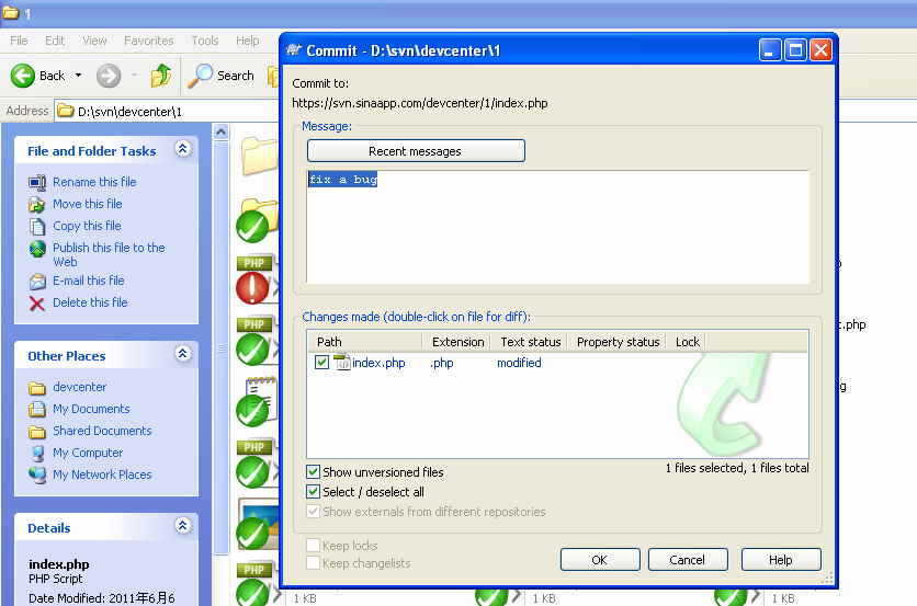 看,剛剛修改過的index.php變色了。下面需要提交(commit)最近的更新。在index.php文件上擊右鍵,出現(xiàn)菜單