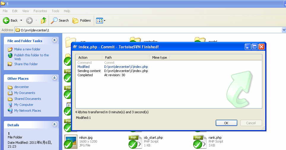 當您看到如下圖所示,表明剛才的修改已經(jīng)成功提交,并且前該devcenter項目的SVN版本號加1,變成30.