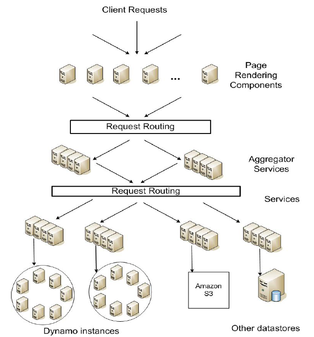 Amazon平臺(tái)是一個(gè)由數(shù)百服務(wù)組成的面向服務(wù)的架構(gòu),其秉承高度去中心化、松散耦合、完全分布式的原則,具體架構(gòu)參考下圖。
