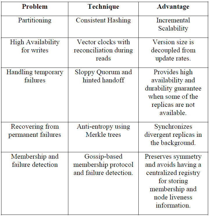 Dynamo作為一類分布式系統(tǒng)的典型代表,其眾多關(guān)鍵技術(shù)給其帶來(lái)一系列的優(yōu)勢(shì),具體參看下表: