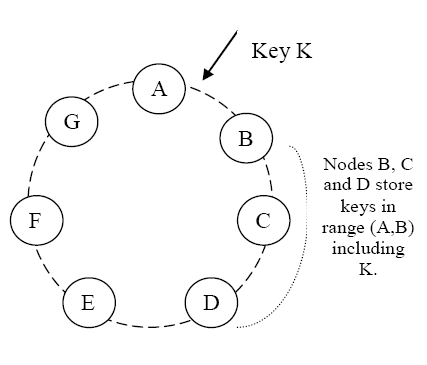 為了實(shí)現(xiàn)高可用,Dynamo將每個(gè)數(shù)據(jù)復(fù)制到N臺(tái)主機(jī)上,其中N是每個(gè)實(shí)例(per-instance)的配置參數(shù),建議值為3。每個(gè)Key被分配到一個(gè)協(xié)調(diào)器(coordinator)節(jié)點(diǎn),協(xié)調(diào)器節(jié)點(diǎn)管理其負(fù)責(zé)范圍內(nèi)的復(fù)制數(shù)據(jù)項(xiàng),其除了在本地存儲(chǔ)其責(zé)任范圍內(nèi)的每個(gè)Key外,還復(fù)制這些Key到環(huán)上順時(shí)針?lè)较虻腘-1個(gè)后繼節(jié)點(diǎn)。這樣,系統(tǒng)中每個(gè)節(jié)點(diǎn)負(fù)責(zé)環(huán)上從其自己位置開(kāi)始到第N個(gè)前驅(qū)節(jié)點(diǎn)間的一段區(qū)域。具體邏輯見(jiàn)圖2,圖中節(jié)點(diǎn)B除了在本地存儲(chǔ)鍵K外,還在節(jié)點(diǎn)C和D處復(fù)制鍵K,這樣節(jié)點(diǎn)D將存儲(chǔ)落在范圍(A, B]、(B, C]和(C, D]上的所有鍵: