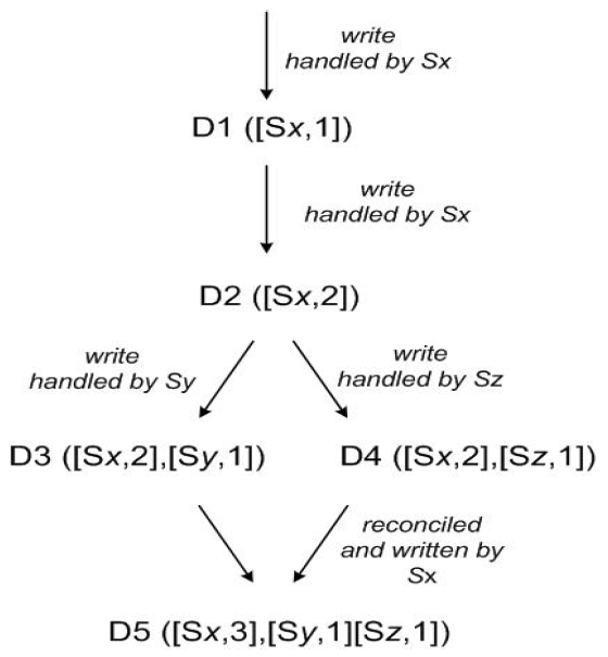 假設(shè)另一客戶端讀取到了D2并嘗試更新它但被另一個(gè)不同的服務(wù)器處理了。節(jié)點(diǎn)Sz處理了這個(gè)請(qǐng)求,則更新該對(duì)象后在該節(jié)點(diǎn)上生成對(duì)象D4和向量時(shí)鐘[(Sx, 2), (Sz, 1)]。