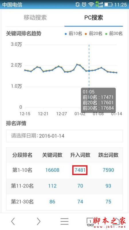 2.關(guān)鍵詞詳情頁,提供具體關(guān)鍵詞在PC搜索和移動搜索下的近30天關(guān)鍵詞影響力、導(dǎo)流量和排名變化趨勢