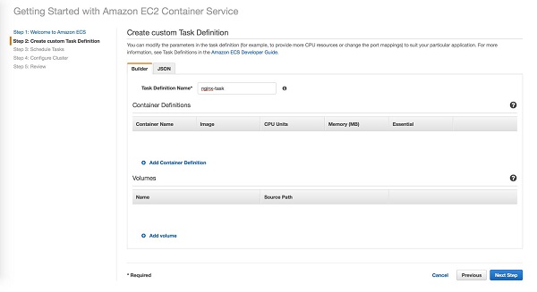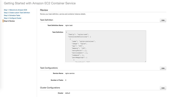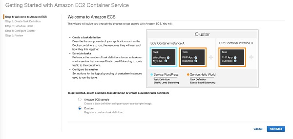 當用戶第一次使用終端訪問ECS服務時,會看到一個簡單的向導。盡管手動的去配置ECS也不是多么繁重的事情,但是第一次的話,使用該向導還是值得嘗試的,它能夠為你配置好所有-你的EC2服務器,一個合適的安全組,以及一個自動伸縮組,正確的AMI(此AMI內置了ECS代理),等等。這是啟動和運行,并獲得ECS經驗的最快方法。
