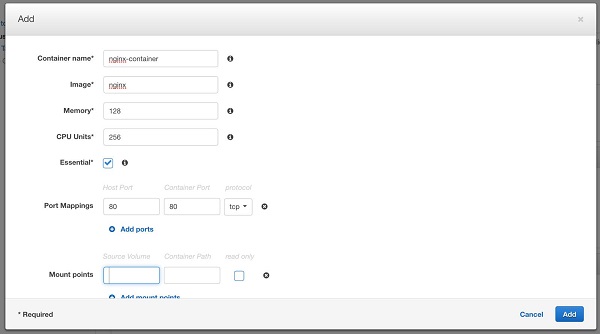 接下來,點擊添加容器定義,即定義nginx容器。 這里主要需提醒的是鏡像的名稱,務必和Docker hub(ngnix)上公開的鏡像名稱一致。當然,也可以指定專有鏡像。