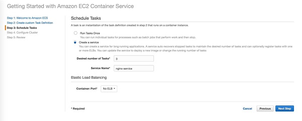 選擇創(chuàng)建服務的單選框,為服務命名,本例為nginx-service,然后設置要運行的任務數,本例為3。這就意味著此服務一旦運行起來,就會創(chuàng)建3個任務,每個任務就是一個獨立的實例,每個實例中都運行著nginx容器。