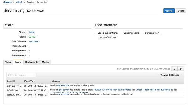 然后回到ECS面板,就可以檢查服務了,當然我們希望看到的是它處于準備好的狀態(tài),且擁有3個任務。