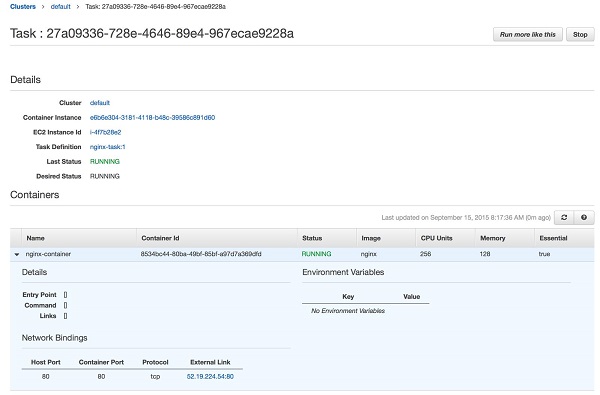 展開nginx-container。在外部鏈接下方,我們可以看到一個HTTP鏈接,指向任務內的容器。