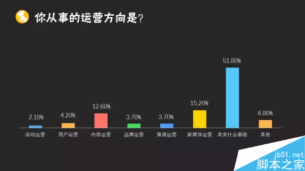 之前天真的以為運(yùn)營(yíng)就是活動(dòng)、用戶、內(nèi)容、品牌、渠道、新媒體方面的工作,入坑后才發(fā)現(xiàn)它還有一個(gè)全新的細(xì)分職能——“什么都得做”,51.8%的運(yùn)營(yíng)屬于于什么都做,簽的合同是運(yùn)營(yíng)干的活是行政、UI、BD、PM,甚至有6.8%的人干的活與運(yùn)營(yíng)無關(guān)。