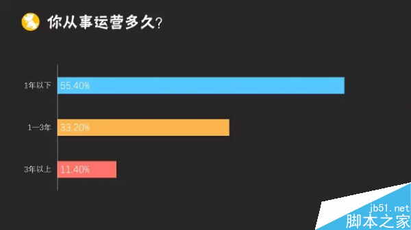 由于缺乏系統(tǒng)性的文章書籍與代表性的人物,大家對(duì)運(yùn)營(yíng)感興趣的時(shí)間點(diǎn)比較晚,大學(xué)生對(duì)運(yùn)營(yíng)的癡迷程度也不及產(chǎn)品經(jīng)理。目前運(yùn)營(yíng)崗位90后當(dāng)?shù)溃?年以下運(yùn)營(yíng)經(jīng)驗(yàn)的占到了55.4%,擁有3年以上經(jīng)驗(yàn)的僅有11.4%。