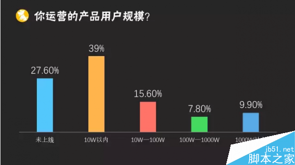 僅有17.7%的運(yùn)營(yíng)在B輪及以上的互聯(lián)網(wǎng)企業(yè),66.7%從業(yè)者在早期創(chuàng)業(yè)互聯(lián)網(wǎng)公司搬磚,他們運(yùn)營(yíng)著用戶總量10萬(wàn)以內(nèi)的小產(chǎn)品,其中有27.6%運(yùn)營(yíng)空有一身本領(lǐng),卻無用武之地,面臨著無產(chǎn)品可倒騰的窘境,這應(yīng)該也是為何會(huì)出現(xiàn)高比例“什么都做”的運(yùn)營(yíng)局面。