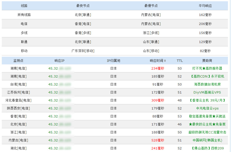 從網(wǎng)絡(luò)工具測(cè)試數(shù)據(jù)來(lái)看,三大運(yùn)營(yíng)商均是走的NTT骨干網(wǎng),效果還不錯(cuò),從ping測(cè)試的數(shù)據(jù)來(lái)看移動(dòng)和聯(lián)通線路比較好,電信稍微差了一些,不過(guò)基本都能穩(wěn)定在200ms內(nèi),相對(duì)優(yōu)化得還是很不錯(cuò)了。