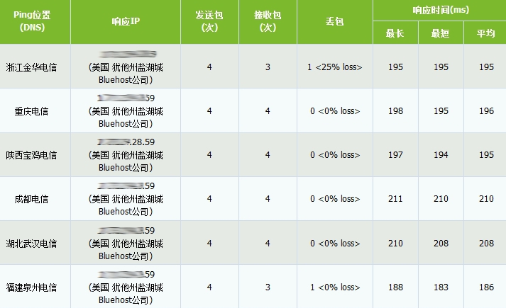 上面是BLUEHOST虛擬主機(jī)機(jī)房速度,白天速度還算可以,電信平均PING在200左右。