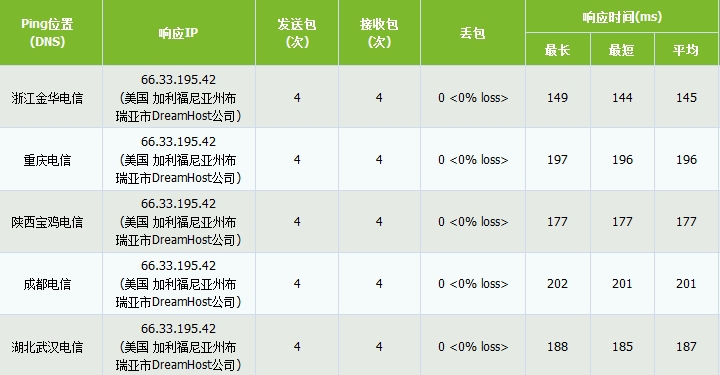 以上是DREAMHOST虛擬主機(jī)速度PING參數(shù),相比較而言,采用SSD固態(tài)硬盤的速度比之前使用DH的時候有所提升,PING電信速度比BLUEHOST也好一些。