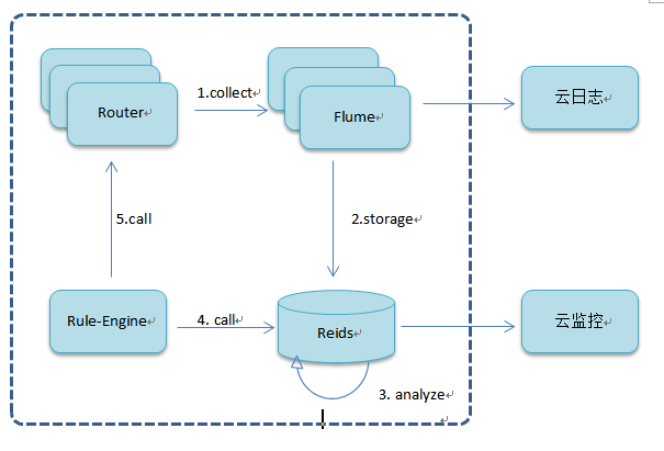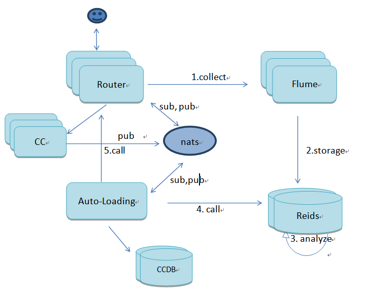所有router服務器都安裝了agent,flume集群實時收集router的nginx訪問日志,保存在redis中并定期進行清理,同時將分析結果保存在同一redis集群中,規(guī)則引擎從redis中取得數(shù)據(jù),與此應用的規(guī)則對比,判斷是否觸發(fā)規(guī)則,之后調(diào)用cloudcontroller restful api 來擴展或縮減實例數(shù)。