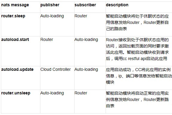 如圖所示,智能啟動也用到了訪問日志的計算結果,計算的是每個應用在統(tǒng)計周期內(nèi)的訪問次數(shù),同樣保存在Redis集群中。智能啟動模塊從CCDB中過濾取得待處理的應用列表,依次獲取Redis關于周期內(nèi)應用的總訪問次數(shù),如發(fā)現(xiàn)為零則先調(diào)用cc restful api 停止應用,再將CCDB中的此應用標識為sleep狀態(tài),同時通知Router更新路由表信息,這樣路由表中既有所有正在運行的應用實例信息,又有sleep狀態(tài)的應用信息。當Router接收到下一個訪問的時候,首先從路由表是查找對應的實例信息,發(fā)現(xiàn)此應用處于sleep狀態(tài),就會激活此應用,并且立刻返回給客戶端一個正在加載頁面。這樣再刷新頁面,就可以正常訪問應用了。下表從nats message來說明模塊間的交互: