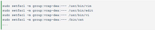 vcap safemode只是設置了應用目錄的權限,限制了目錄間的訪問,但是仍然可以看到或操作大部分系統(tǒng)命令,系統(tǒng)文件,如ls, mkdir, /usr/bin,/etc/init.d/,這是很危險的。JAE通過linux的ACL(access control list)將大部分的系統(tǒng)命令都禁掉了,這有點殺敵一千自損八百的味道,很多應用是需要調(diào)用系統(tǒng)命令的。ACL的具體做法是限制了用戶組vcap-dea對絕大多數(shù)系統(tǒng)命令的查看、操作權限: