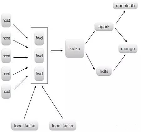 具體架構(gòu)上,agent并沒把數(shù)據(jù)直接發(fā)送到kafka,在kafka前面有層由flume構(gòu)成的forward。這樣做有兩個原因