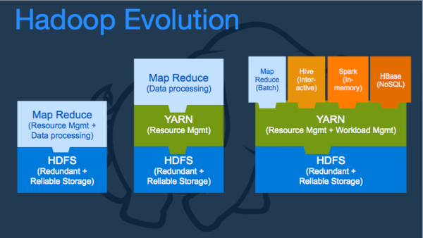 基礎(chǔ)架構(gòu)的創(chuàng)新主導(dǎo)了Hadoop 的進(jìn)化,從最初的基于HDFS和MapReduce的批處理應(yīng)用不斷演變,第一代的Hadoop提供了靈活和可擴(kuò)展的數(shù)據(jù)結(jié)構(gòu)和處理能力,并在大數(shù)據(jù)興起之時(shí)滿足了公司各種大小數(shù)據(jù)處理需求提供了民主化需求。然而畢竟其只是第一步,有著各種限制,如果將其對(duì)比于操作系統(tǒng)的話, 第一代Hadoop就如操作系統(tǒng)和應(yīng)用,例如記事本捆綁在一起,且僅有一個(gè)應(yīng)用,即MapReduce。然而隨之而來(lái)的大量任務(wù)導(dǎo)致了調(diào)度瓶頸,從而促成了YARN(Yet Another Resource Negotiator)項(xiàng)目的成立和發(fā)展,其解決了JobTracker在超大規(guī)模集中成為瓶頸等問(wèn)題,并支持各種應(yīng)用通過(guò)YARN來(lái)進(jìn)行資源調(diào)度和管理從而將Hadoop帶入了下一個(gè)時(shí)代,