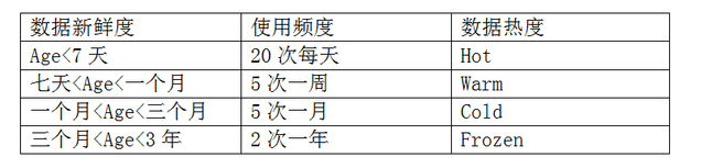 不同類型的數(shù)據(jù)集通常都存放在同一個(gè)集群中,并被不同的團(tuán)隊(duì)共享以運(yùn)行各種應(yīng)用來(lái)滿足業(yè)務(wù)需求。而數(shù)據(jù)的一個(gè)共同特點(diǎn)是其使用率會(huì)隨著時(shí)間而逐漸降低,越新的數(shù)據(jù)使用率越高,而越舊數(shù)據(jù)的訪問(wèn)次數(shù)逐漸降低。初次生成的數(shù)據(jù)有著最大的使用率,我們將其定義為Hot,基于我們的分析,一周內(nèi)訪問(wèn)量下降的數(shù)據(jù)被稱為Warm,而之后三個(gè)月內(nèi)只有少量訪問(wèn)的數(shù)據(jù)被稱為Cold。最后,訪問(wèn)率降低到每年僅有幾次甚至為零的數(shù)據(jù)集被稱為Frozen,如下表: