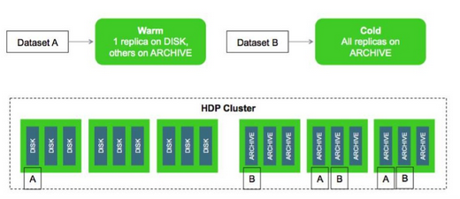 將低熱度數(shù)據(jù)集與高熱度數(shù)據(jù)集作不同存放的策略已勢(shì)在必行,在Hadoop 2.3中,HDFS支持了分層存儲(chǔ),通過(guò)在集群中添加歸檔存儲(chǔ)能力為冷數(shù)據(jù)提供深層存儲(chǔ)能力,且保持對(duì)于上層應(yīng)用的透明性。由于數(shù)據(jù)依然在同一個(gè)集群中,因此當(dāng)請(qǐng)求需要訪問(wèn)相應(yīng)冷數(shù)據(jù)時(shí)依然可以及時(shí)獲得。例如,我們可以為上面的例子中添加100個(gè)節(jié)點(diǎn),每個(gè)節(jié)點(diǎn)附帶200TB存儲(chǔ)但僅使用有限的計(jì)算資源,于是整個(gè)集群的總量將變?yōu)?0PB (20PB 磁盤+20PB歸檔)。通過(guò)相關(guān)數(shù)據(jù)策略,將不同熱度的數(shù)據(jù)分布到不同存儲(chǔ)上,例如,假設(shè)每份數(shù)據(jù)按Hadoop默認(rèn)設(shè)置復(fù)制三份,對(duì)于Hot型數(shù)據(jù)則將三份數(shù)據(jù)全部存放在快速磁盤上,對(duì)于Warm類型數(shù)據(jù)僅存放一份拷貝在快速磁盤而其余兩份放到歸檔存儲(chǔ),將Cold和Frozen數(shù)據(jù)全部存放于歸檔中。從而將不同的數(shù)據(jù)進(jìn)行有效分配,示例如下圖:
