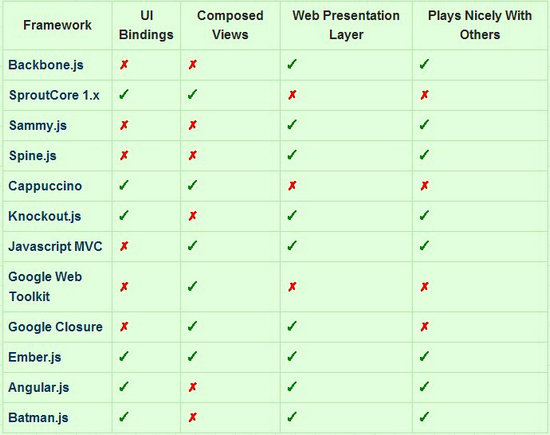 下面是2012年外國(guó)對(duì)當(dāng)時(shí)流行12個(gè)JavasScript MVC框架的純技術(shù)評(píng)估: