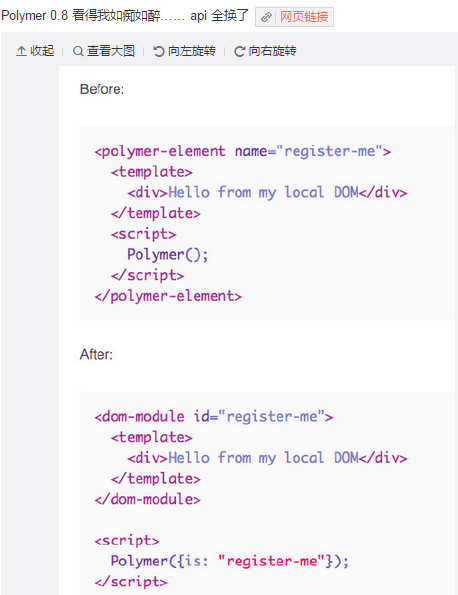 如果你的項(xiàng)目是一個(gè)跨度三年以上的大工程,用《人月神話》的術(shù)語(yǔ)來說,90%就是個(gè)焦油坑。我們需要使用更穩(wěn)健成熟的技術(shù)方案,我們需要重點(diǎn)避開谷歌的產(chǎn)品,它的許多產(chǎn)品都是玩票性質(zhì),GWT、Closure、Darty就是前車之鑒。Polymer基于許多新技術(shù)構(gòu)建,其中Object.observe()、 Custom Elements、HTML Imports、Shadow DOM、Model-Driven Views還遠(yuǎn)遠(yuǎn)沒被標(biāo)準(zhǔn)化, 許多還是獨(dú)家的,變數(shù)太大,因此才出現(xiàn)下圖所示的悲劇。 Angular不是我黑它,這東西也喜歡斷崖式升級(jí),它在1.08時(shí)兼容IE6-8,1.2時(shí)需要打補(bǔ)丁兼容舊式IE,1.3摒棄了對(duì)舊式IE的兼容,直接在源碼中刪除了所有兼容代碼,因此所有補(bǔ)丁方案都無力回天,并且不支持全局Ctrl函數(shù),許多模塊需要獨(dú)立引用,1.4不向下支持動(dòng)畫模塊,2.0由at改成ts構(gòu)建,由于使用Object.observe(),因此不支持IE6-11,Chrome30……