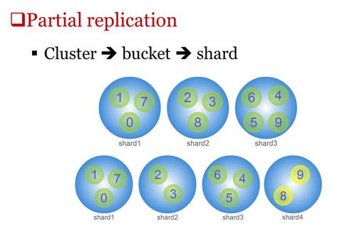 第二個關(guān)鍵問題是任何一個邏輯的集群、業(yè)務(wù)數(shù)據(jù)量會增長、變化,所以必須支持在線、動態(tài)、重新的分片,或者說重新的Sharding,這個Sharding核心思想不是簡單把集群分片,中間要加一個抽象,才能進(jìn)行動態(tài)的重新分片。對于這個策略來說,中間加一個bucket的抽象,然后來進(jìn)行管理。遷移的過程是通過復(fù)制來做的,學(xué)術(shù)界或工程界喜歡管它叫“Partial replication”。舉例來說,原來是3個分片,現(xiàn)在怎么變成4個分片?通過調(diào)度算法,決策把哪些分片中的bucket遷移到這里,遷移是通過復(fù)制來做的,建一個復(fù)制關(guān)系,但是這個復(fù)制關(guān)系并不是復(fù)制它原來所有的數(shù)據(jù),所以要求復(fù)制協(xié)議的實現(xiàn)是要做特殊的事情,只要這一個區(qū)間的復(fù)制,復(fù)制全部完成之后更改拓?fù)?,最后生效,這可以做并行的Partial replication做遷移。從數(shù)據(jù)的可靠性保證比較高,技術(shù)也比較簡單和傳統(tǒng)。
