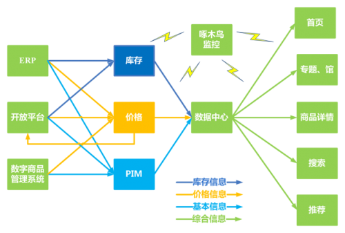 當(dāng)當(dāng)網(wǎng)的商品數(shù)據(jù)有多個(gè)來源,自營(yíng)實(shí)物商品來源于ERP系統(tǒng),電子書來源于數(shù)字業(yè)務(wù)系統(tǒng),商家商品來源于開放平臺(tái),最終這些商品的數(shù)據(jù)都由主業(yè)務(wù)系統(tǒng)中的PIM、庫(kù)存系統(tǒng)、價(jià)格系統(tǒng)集中統(tǒng)一管理,再發(fā)布到搜索系統(tǒng)、推薦系統(tǒng)、前端頁(yè)面展示等系統(tǒng)。為了對(duì)商品信息中的關(guān)鍵數(shù)據(jù)同步時(shí)效進(jìn)行監(jiān)控,當(dāng)當(dāng)網(wǎng)建立了啄木鳥監(jiān)控系統(tǒng),覆蓋了近20個(gè)信息流路徑數(shù)百個(gè)節(jié)點(diǎn),對(duì)超出同步時(shí)限的環(huán)節(jié)自動(dòng)報(bào)警,以便及時(shí)處理,避免發(fā)生嚴(yán)重的延遲。