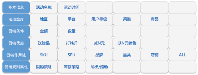 可能這里會(huì)引發(fā)困擾,基礎(chǔ)信息的時(shí)間為何不能算做時(shí)間維度?維度也定義了一些限制條件,那和促銷工具模型里的條件有什么區(qū)別?時(shí)間之所以不歸入維度,是基于前面對(duì)活動(dòng)的定義,時(shí)間范圍是必須的,而維度是可選的;促銷模型中的條件只對(duì)于促銷工具有效和有意義,而維度則有更廣泛的普適性,例如平臺(tái)、渠道、地區(qū)、用戶、商品等,與工具是什么并無關(guān)系。