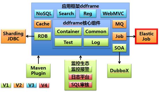 elastic-job原本是當(dāng)當(dāng)java應(yīng)用框架ddframe的一部分,本名dd-job。ddframe包括編碼規(guī)范,開(kāi)發(fā)框架,技術(shù)規(guī)范,監(jiān)控以及分布式組件。ddframe規(guī)劃分為4個(gè)演進(jìn)階段,目前處于第2階段。3、4階段涉及的技術(shù)組件不代表當(dāng)當(dāng)沒(méi)有使用,只是ddframe還未統(tǒng)一規(guī)劃。